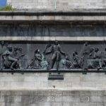 - The bas-relief panel designed by John Hogan (1800-58), and completed by his son John Valentine Hogan (1840-1920) under the direction of Giovanni Maria Benzoni (1809-73), is an allegorical depiction of Wellesley accepting the civic crown from Britannia and presenting a scroll of freedom to Hibernia, the whole symbolising his key role as Prime Minister during the passing of the Roman Catholic Relief Act in 1829. The Wellington Testimonial, Phoenix Park. National Inventory of Architectural Heritage.